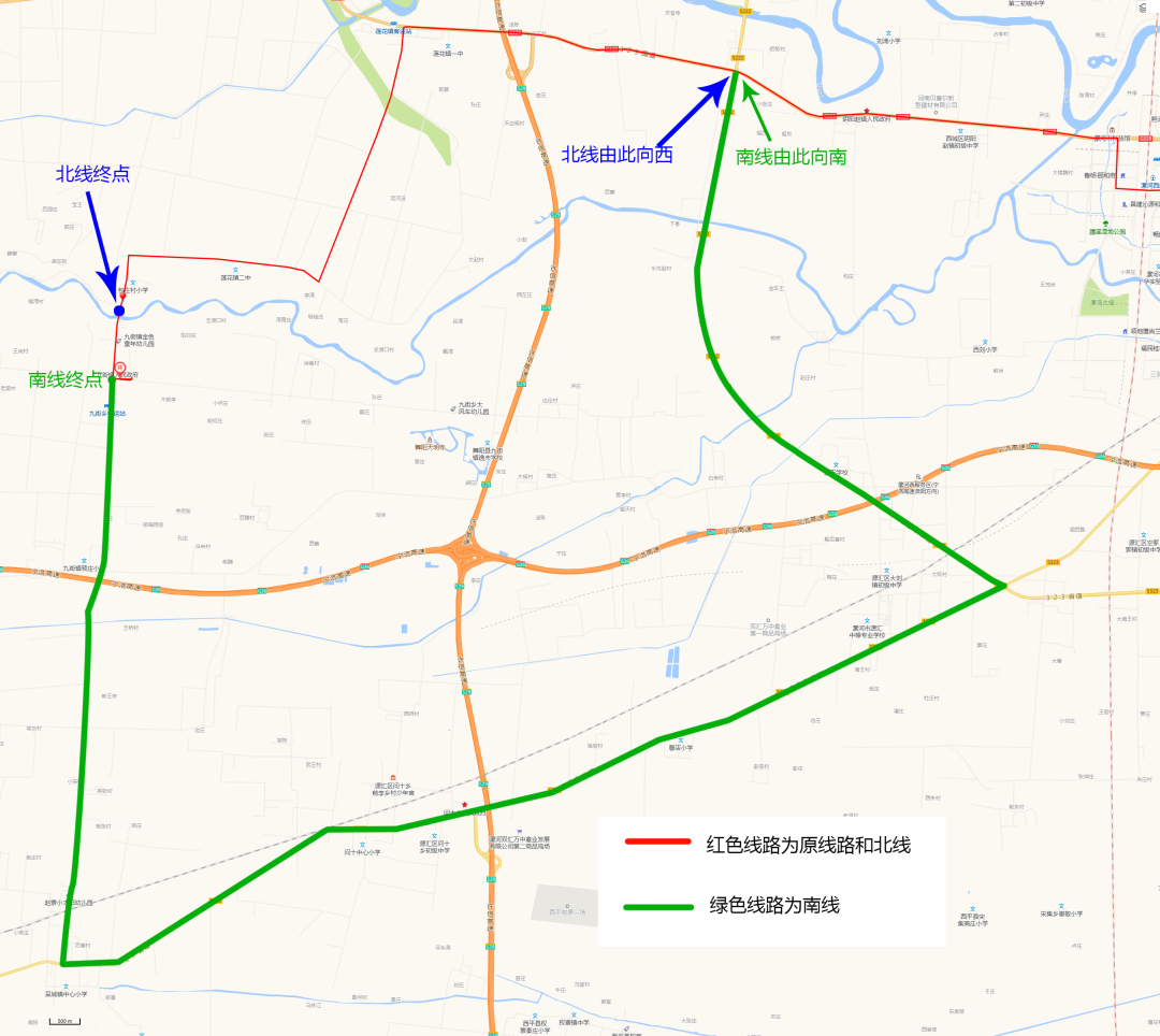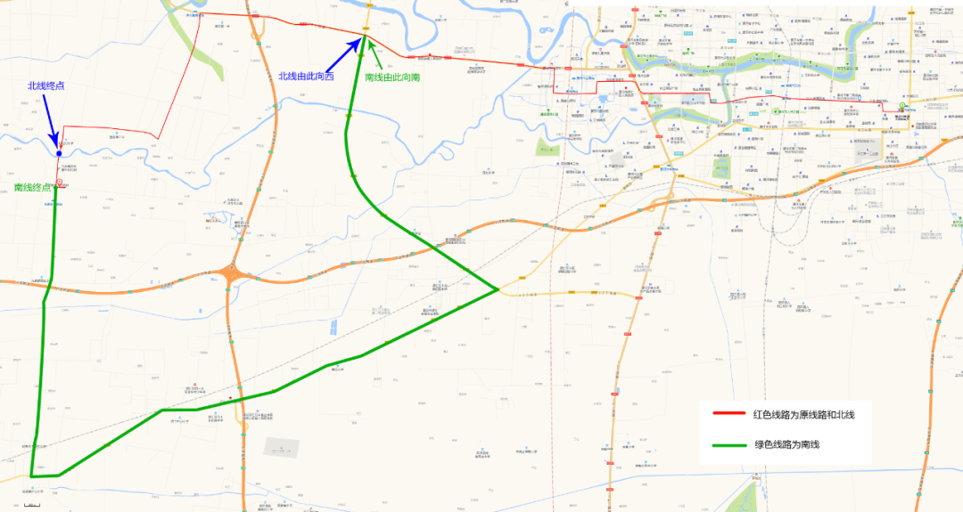 根据上级部门通知,明天起九街澧河桥将进行封闭施工。经公司研究决定暂时分南、北两条线路进行运营,具体线路见下图。